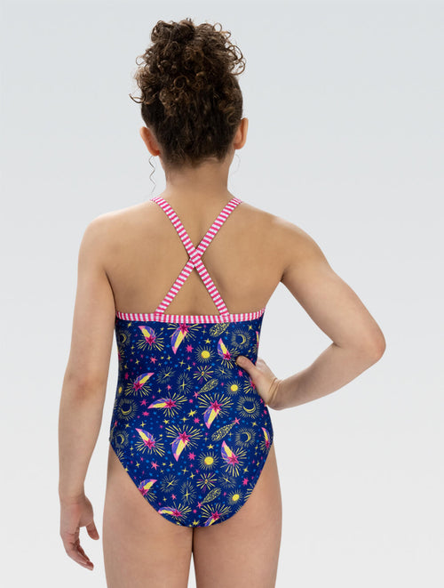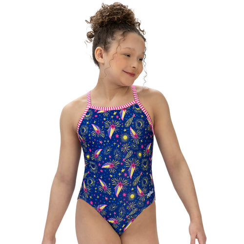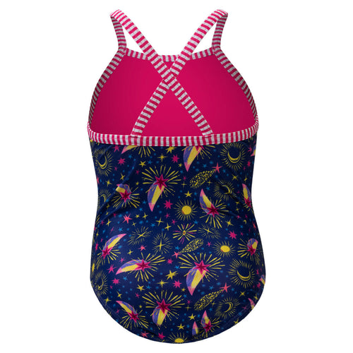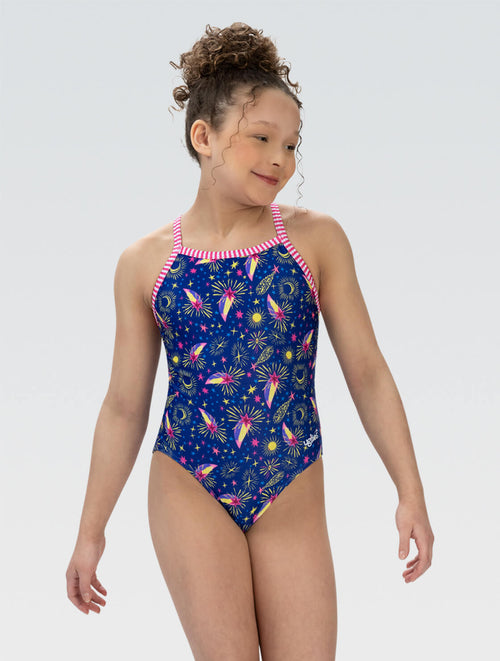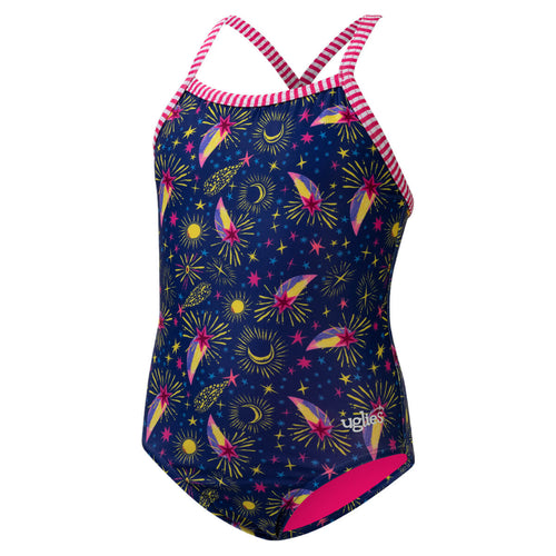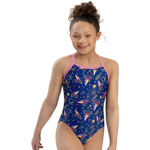 Dream under the stars with the Uglies Girls' Moonlight Criss-Cross Back One Piece! This enchanting swimsuit has a dreamy print of stars, moons, and other sparkly things from the night sky. Perfect for active girls, this suit is made to handle lots of swimming with its chlorine-resistant fabric, UPF 50+ sun protection, and ability to keep its shape. The criss-cross back design lets you move with ease. Dive into fun with a swimsuit that's as special as you are!