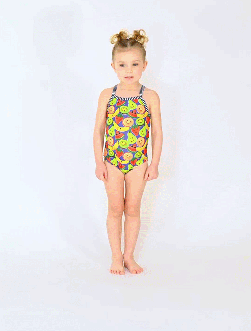 Your swimmer will be making a splash with a taste of fun in the Little Dolfin Girls' Fruit Snack One Piece! This playful swimsuit is covered in a delightful assortment of fruity friends, bringing a smile to every swim. Constructed from a durable and chlorine-resistant fabric, this suit is built to withstand hours of play in the water. The vibrant colors are designed to last, thanks to excellent color retention. It also provides UPF 50+ sun protection, making it a great choice for sunny days.